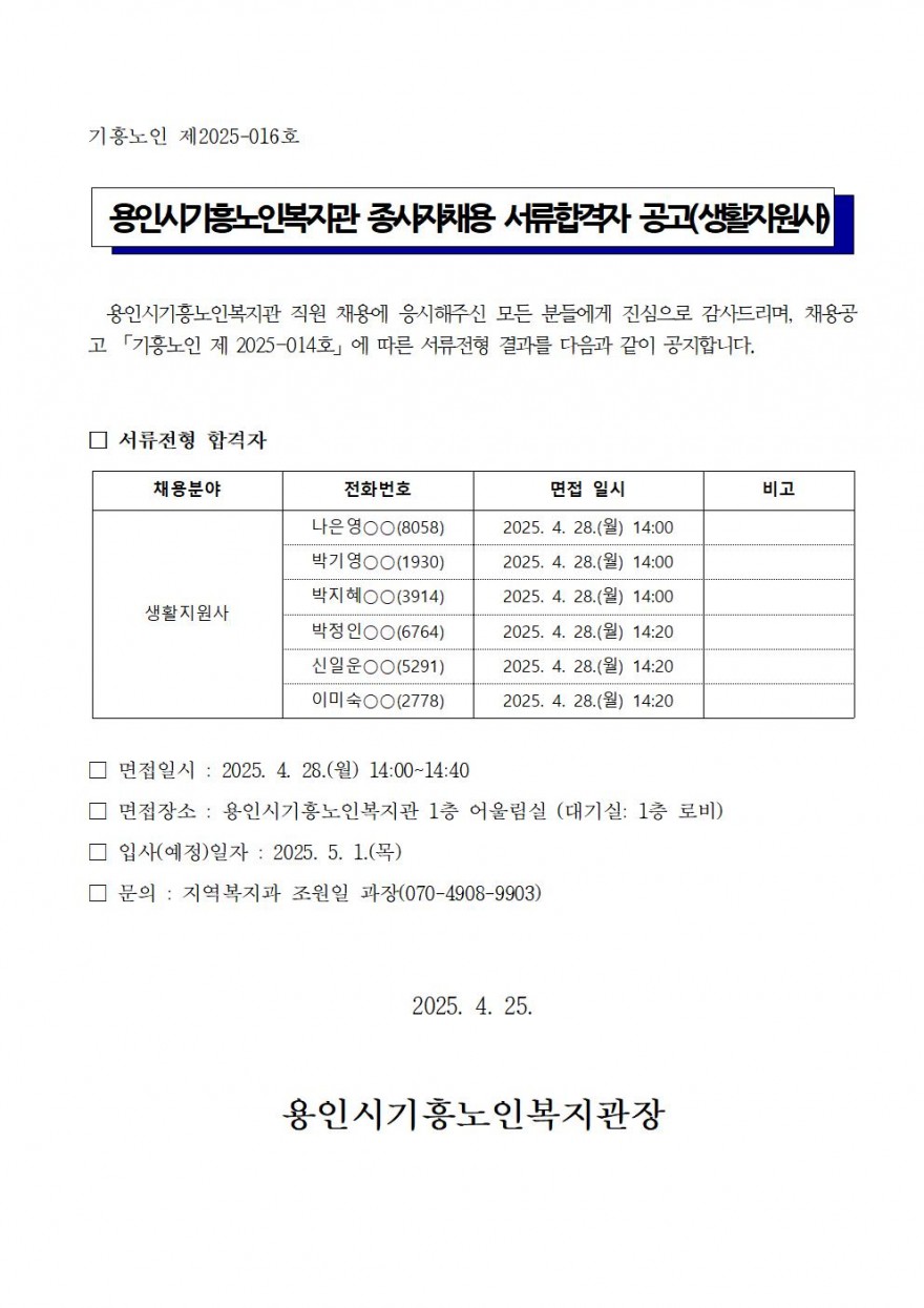 [제2025-007호] 종사자 채용 서류합격자 공고(2025년 노인맞춤 돌봄서비스 생활지원사) 페이지 정보 작성자 과장 조원일 댓글 0건 조회 3,043회 작성일 25-04-25 09:44 본문 용인시기흥노인복지관 생활지원사 1차 서류합격자를 다음과 같이 공고합니다. 목록 이전글종사자 채용 최종합격자 공고(2025년 노인맞춤 돌봄서비스 생활지원사) 25.04.29 다음글[제2025-015호] 종사자 긴급채용 공고(운전원) 25.04.21 댓글목록 댓글목록 등록된 댓글이 없습니다.