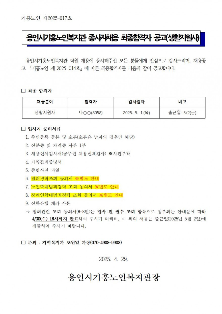 종사자 채용 최종합격자 공고(2025년 노인맞춤 돌봄서비스 생활지원사)