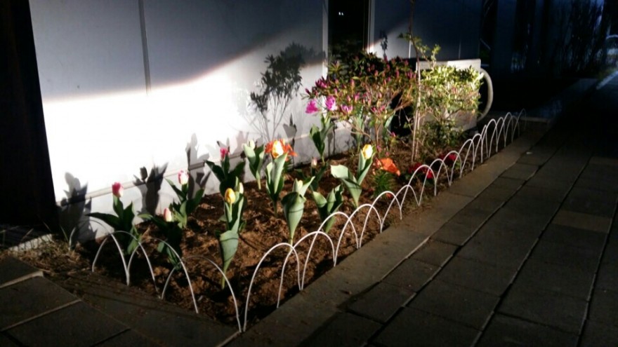 관장님은 헤드-라이트를 "튜립 화단" 에 비추어주시고