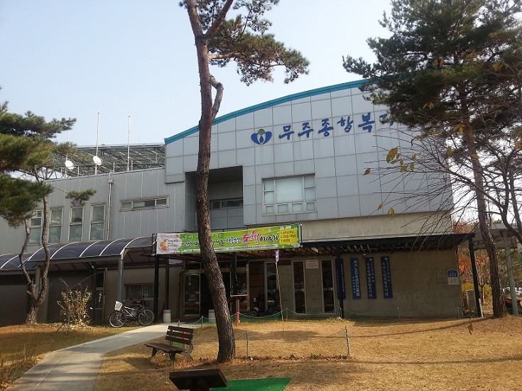 넓은 주차장을 끼고 지상2층, 지하1층(약926평)으로 지어진 아담한 흰색건물이 눈에 들어온다. 미리 나와 대기한듯한 직원들이 버스에서 내리는 우리를 따듯한 미소 속에 “어서 오시라”며 반겨준다. 2층의 한 강의실에서 무주복지관 소개영상과 함께 전략기획팀장 분의 개략적인 현황소개의 안내를 받았다. 무주복지관은 2005년12월 설립되어 원불교복지법인 “삼동회”가 위탁경영하고 있으며 노인/장애인/다문화/여성일자리등 4개의 복지기능이 같은 건물에서 통합되어 유기적인 연계 속에 무주군민 2만5천명중 등록회원 5천여명이고 하루 450명의 회원들이 이용하고 있다 하고 건물은 ㅁ 형태로 지어져 중앙의 공간활용이 돋보였다. 각종 강의실과 회의실외 요리/휘트니스/락밴드/국악실등이 따로 있어 우리와는 큰 건물이 판이하게 비교되는 부러운 느낌을 갖게 되었다. 반디작업장에서는 소득연계사업으로 두부/콩나물/지역특산물을 판매하고 있었다. 약 한 시간에 걸친 전담직원의 설명 속에 모든 시설을 차분하게 견학하였다.
