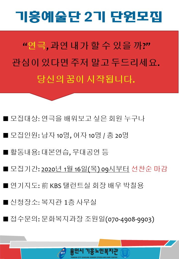 [문화복지과] 기흥예술단 2기 단원 모집안내 페이지 정보 작성자 문화복지과장조원일 댓글 0건 조회 11,929회 작성일 20-02-25 16:29 본문 문의: 문화복지과장 조원일(070-4908-9903) 목록 이전글코로나 블루 극복하기 20.03.31 다음글[문화복지과] 용인시기흥노인복지관 기흥벗봉사단 모집공고 20.02.25 댓글목록 댓글목록 등록된 댓글이 없습니다.