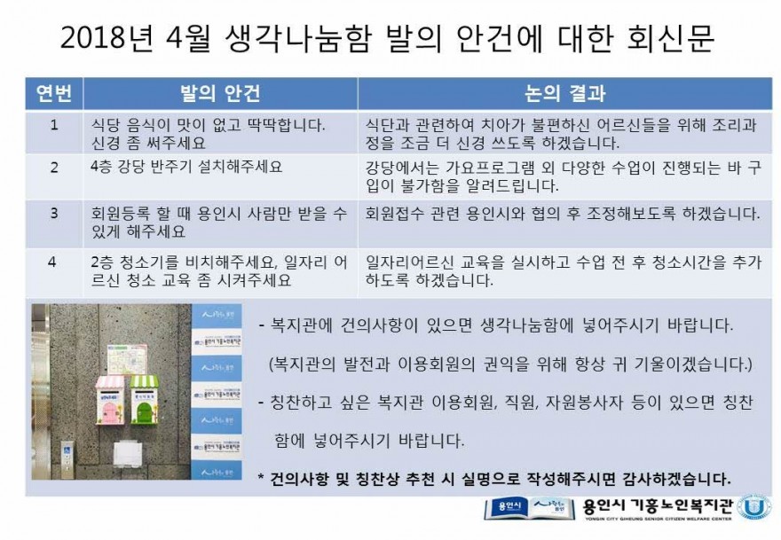 용인시기흥노인복지관에서는 어르신들의 의견에 귀 기울이고자 '생각나눔함' 을 운영하고 있습니다.
