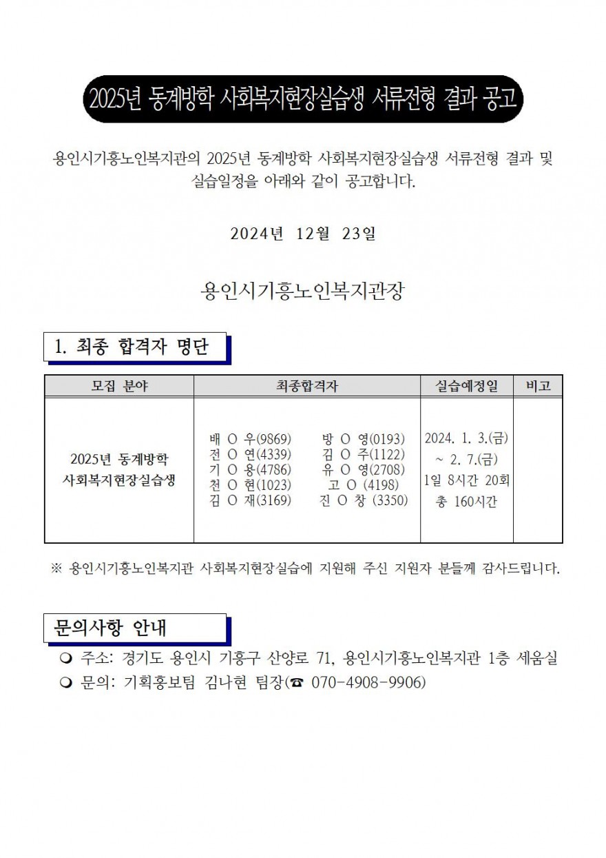 2025년 동계방학 중 사회복지현장실습 선정대상자 결과 공고 작성일 24-12-23 16:42 페이지 정보 작성자홈페이지관리자 조회 3,053회 댓글 0건 본문 이전글 다음글 목록 댓글목록 댓글목록 등록된 댓글이 없습니다.