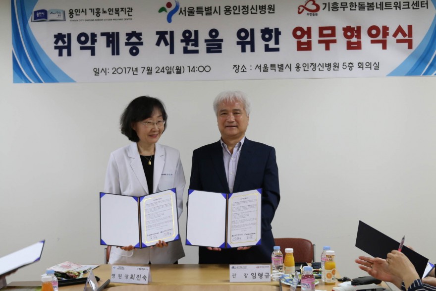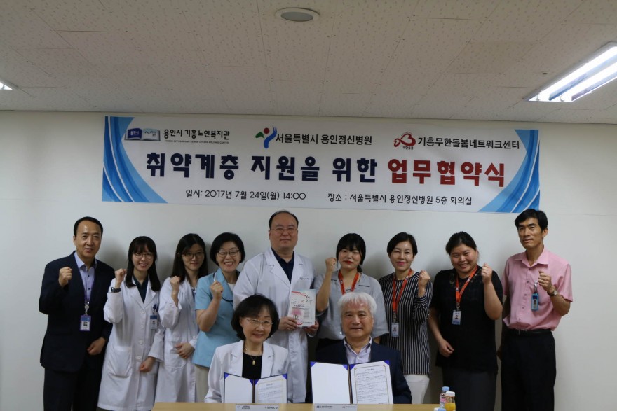 기흥무한돌봄네트워크센터에서는 2017년 7월 24일(월) 서울특별시 용인정신병원 5층 회의실에서 지역사회 취약계층 의료 지원을 위한 업무 협약을 체결하였습니다. 협약식에는 기흥노인복지관 임형규 관장과 서울특별시 용인정신병원 최진숙 병원장이 참석하였고, 이번 협약을 통해 기흥노인복지관 이용 어르신 및 기흥무한돌봄네트워크센터 사례관리 대상자들의 건강한 삶을 위해 적극적인 의료서비스 제공을 위해 상호 협력할 계획입니다.