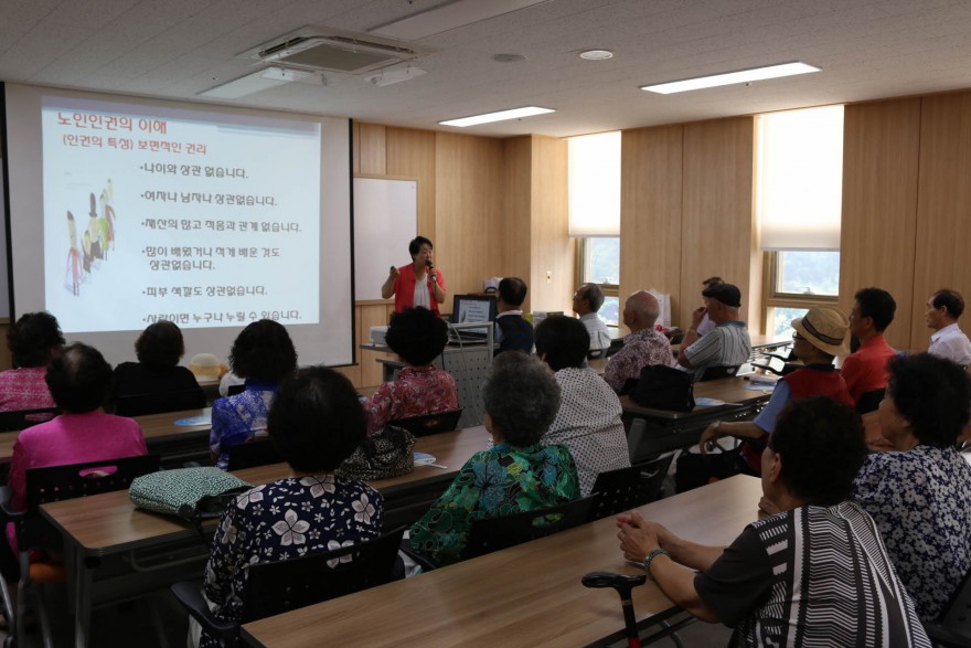 이번교육은 서로간의 친밀감 형성을 위한 인사법, 노인인권의 이해, 나를 사랑하는 습관, 어르신들이 공감할 만한 노래(고기잡이, 굳세어라 금순아 등)와 율동을 같이해보는 교육이었다.
